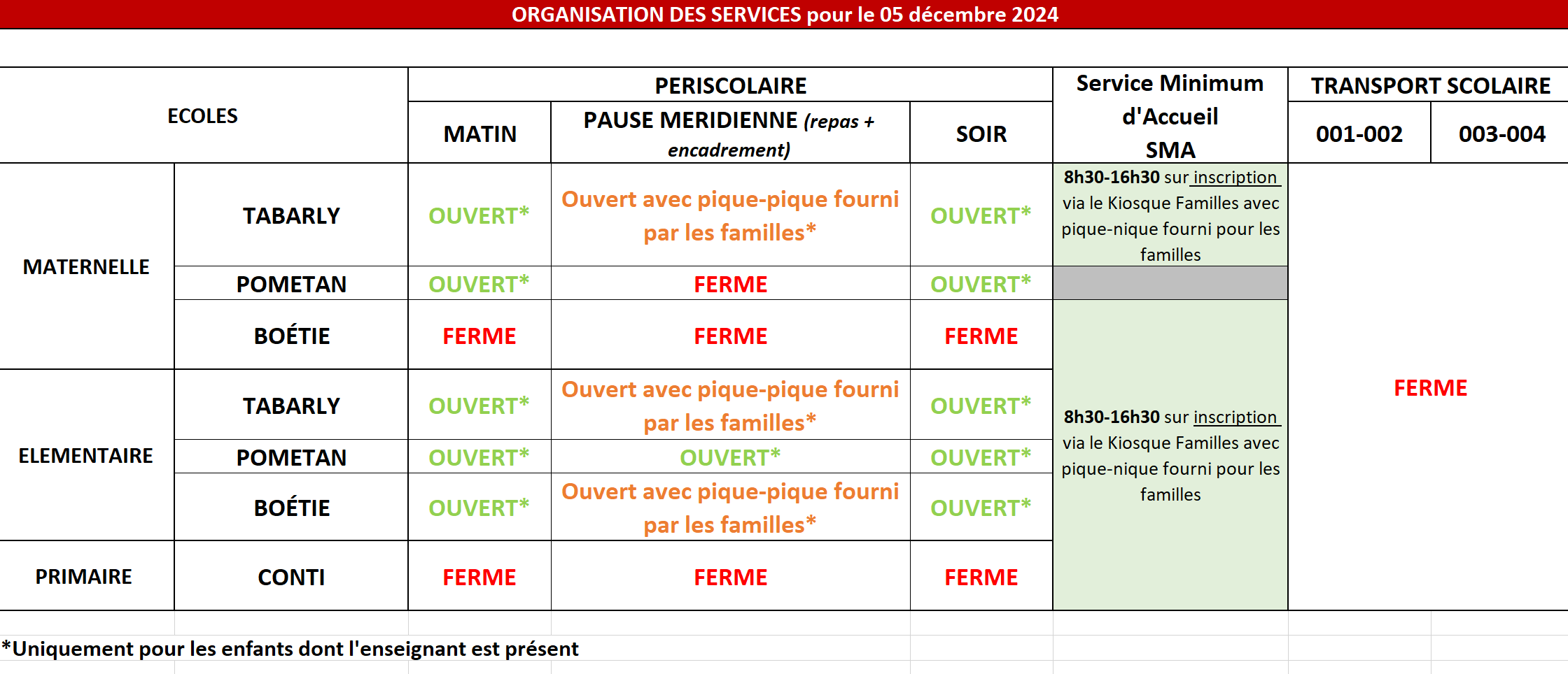 En raison du mouvement de grève nationale prévu le jeudi 5 décembre 2024, vous trouverez ci-dessous le point de la situation dans chaque école.
