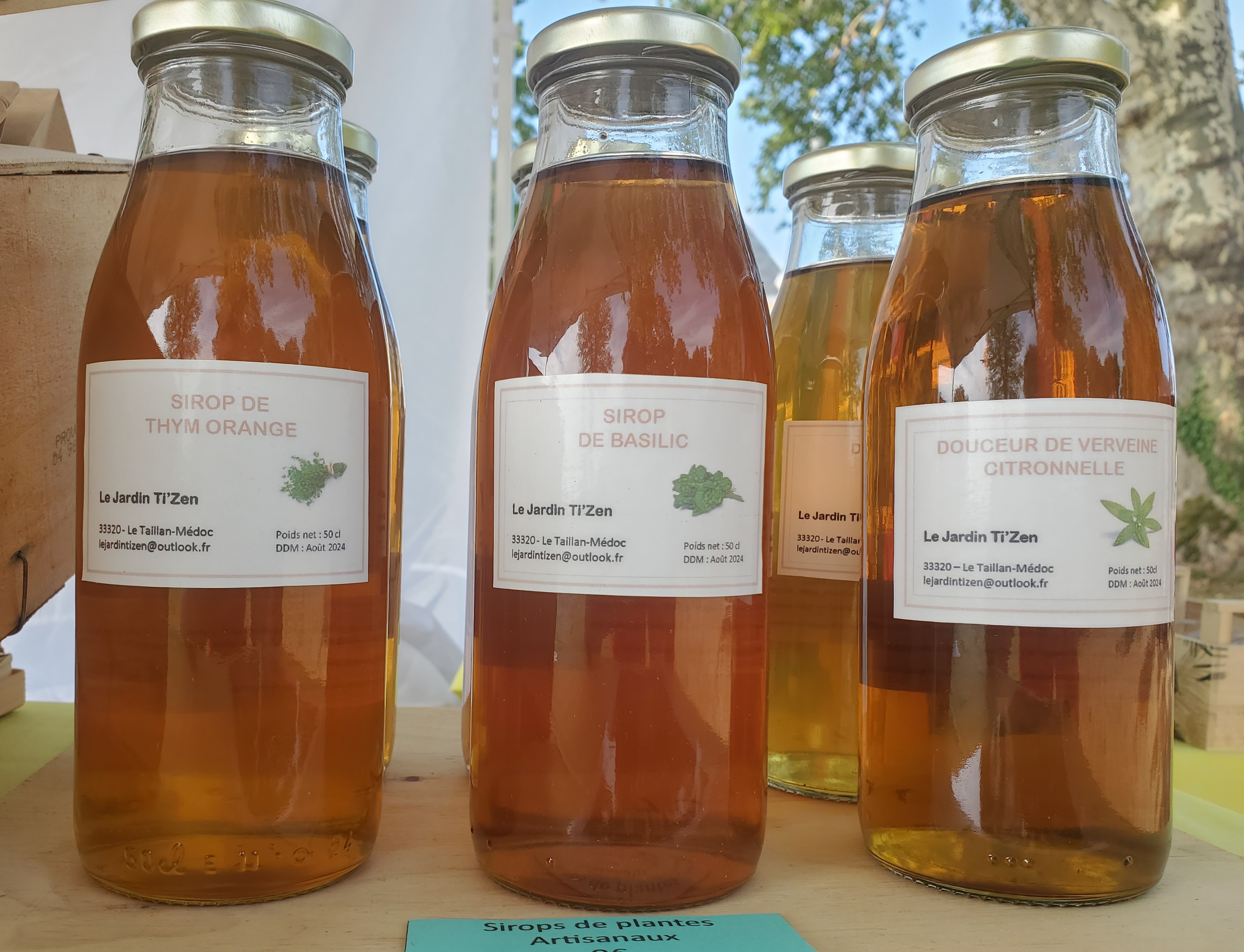 Depuis aout 2023, je prépare également des sirops à partir des plantes de mon Jardin (Sirop de basilic, verveine citronnelle, thym orange et d'autres sont à venir !) et des tisanes à base de chanvre.
