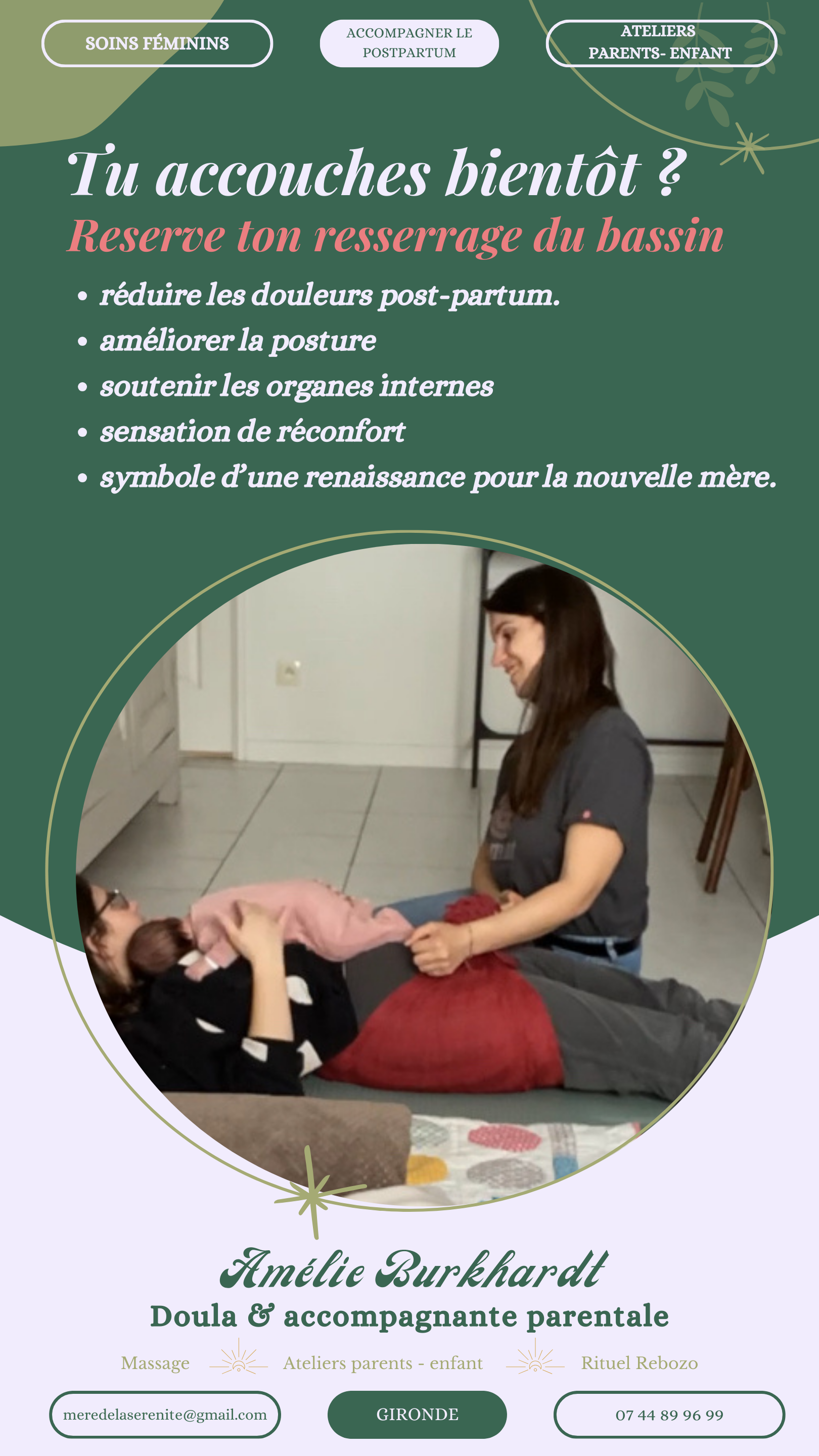 Je m’appelle Amélie, j’accompagne les femmes pendant la grossesse, l’accouchement et pendant le post partum pour un vécu plus serein.